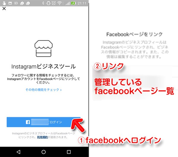 ③[Facebookページをリンク]画面でインスタグラムのビジネスプロフィールと関連付けるページを選択