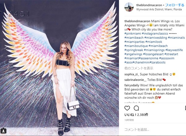 流行やトレンドを発信するSNSとして人気のあるインスタグラムでは、やはり非日常の世界観を演出する必要があります。例えば撮影場所に美術館やミュージアム、高級レストランを選ぶなど、独特な雰囲気を持った場所選びもポイントになります。画像の例は「天使の羽アート」と呼ばれ、アメリカのアーティスト、コレット・ミラーさんの作品がオリジナルになり流行しました。