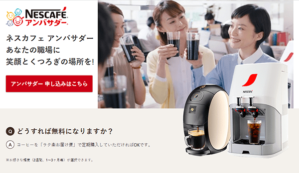 ネスカフェのCMでもお馴染みのネスカフェアンバサダーは、アンバサダーとして登録して審査に通ればネスカフェ ゴールドブレンド バリスタマシンなどが無料でオフィスに提供されるシステムです。1杯20円~本格的なコーヒーが味わえると好評で、30万人を超えるアンバサダーを獲得しています。1人の職場でも申し込めるため、美容室や病院などでも申し込みが可能です。