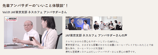アンバサダーの皆さんは公式サイトやTV CMといったメディアでも本人たちが取り上げられています。公式サイト上では「先輩アンバサダーの“いいこと体験談”! 」としてJAF東京支部 ネスカフェ アンバサダーさんの声などが紹介されています。