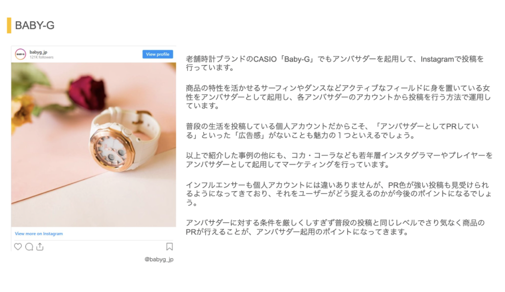 老舗時計ブランドのCASIO「Baby-G」でもアンバサダーを起用して、Instagramで投稿を行っています。