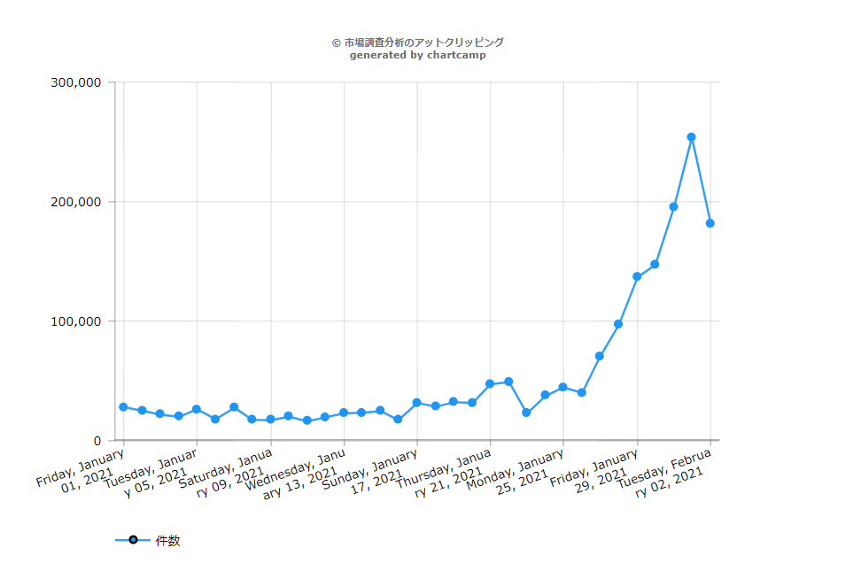 2021年1月1日(月) ~ 1月26日(火)の平均投稿数が27,344件であったのに対し、1月27日(水)には7万件を、29日(金)には10万件を超えました。