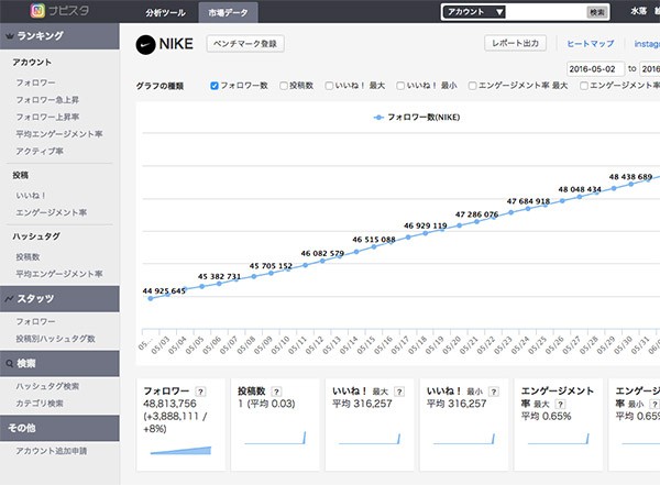 またアカウントの運営担当者は単純にエンゲージメント数だけでなく、投稿ごとのエンゲージメント率がどのように変化しているかも日々チェックしたい項目の一つです。