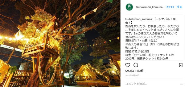 「椿森コムナ」は千葉公園の目の前の住宅街に作られた小さな森にツリーハウス、タイニーハウス(小屋)、エアストリーム(キッチンカー)を集め、コミュニティシェアスペースを運営しています。オーガニックコーヒーやオーガニックティーなど素材にこだわったカフェもあり、都会からのアクセスもよいアウトドア施設です。子供から大人まで楽しめる空間は、カラフルな飾りつけがされたり、ライトアップで幻想的なインスタ映えする空間作りも工夫されたりしています。