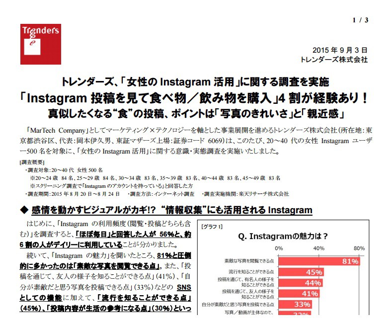 2015年9月3日にトレンダーズ株式会社が発表した「女性のInstagram活用」に関する調査によれば、全体の四割の女性ユーザーが「Instagram投稿を見て食べ物・飲み物を購入した経験がある」とのことです。