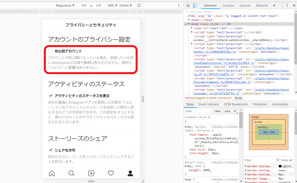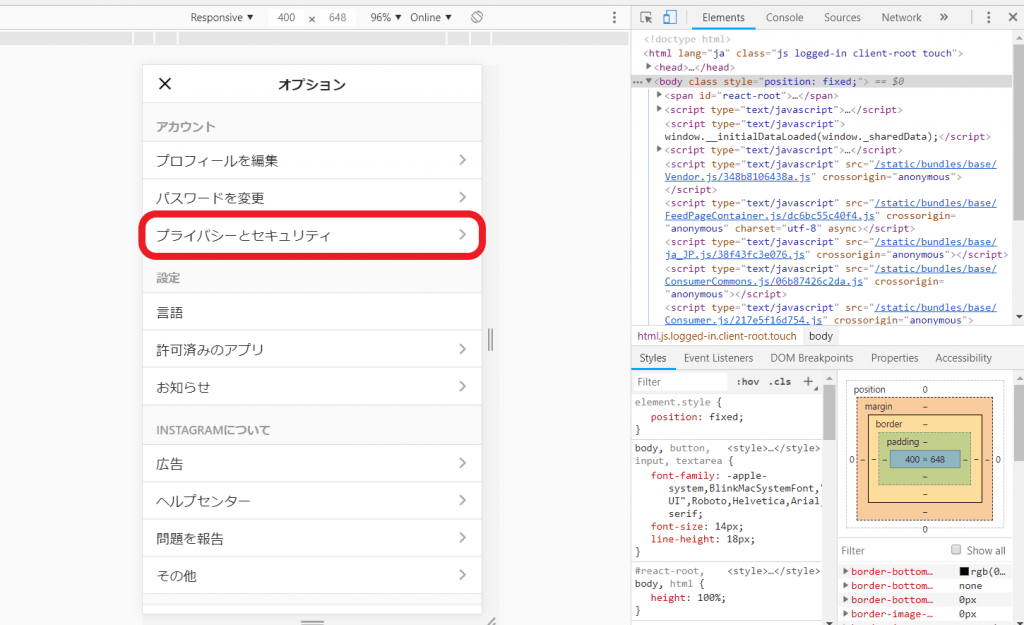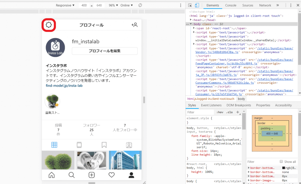 すると、以下のように左側にインスタグラム、右側にサイトのソースコードが表示されるようになります。ソースコードの上部にある「スマホ・タブレットボタン(Toggle device toolbar)」をクリックします。