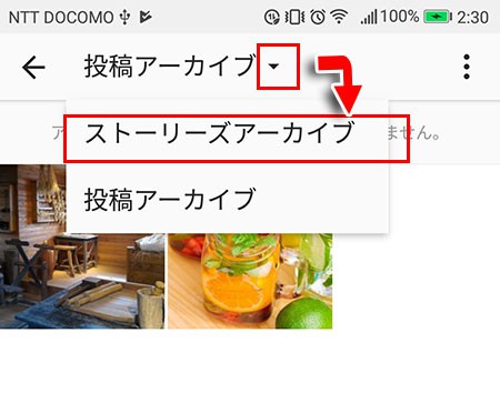 確認画面では通常の写真や投稿のアーカイブとストーリーズのアーカイブがあります。それらを切り替えるには「アーカイブ」という文字の右にある「V」のマークから行うことができます。
