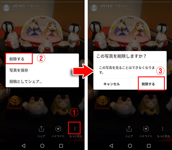 3.画面右下の3点(①)をタップし、「削除」(②)をタップし、もう一度「削除する」(③)をタップして確定します。