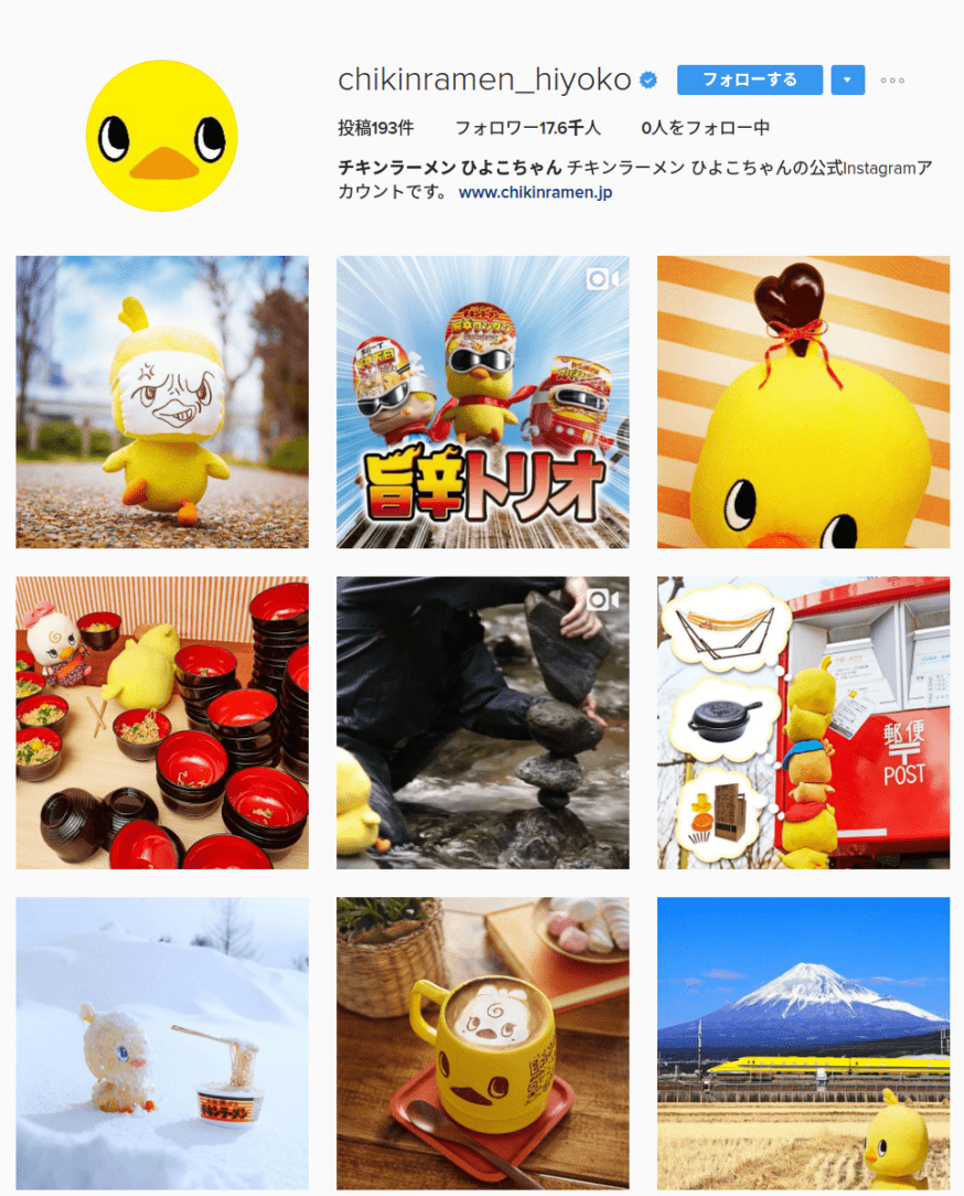 商品キャラクターであるひよこちゃんを中心とした「チキンラーメン」。フォロワー数は176,000人で、可愛らしい投稿で幅広い世代の人気を獲得しています。チキンラーメンのメインターゲットは親子で、そういった層向けの世界観をインスタグラムで演出しているのが特徴となります。これからインスタグラムを利用する企業は、広告らしさを感じさせない商品紹介にも着目してみるといいでしょう。