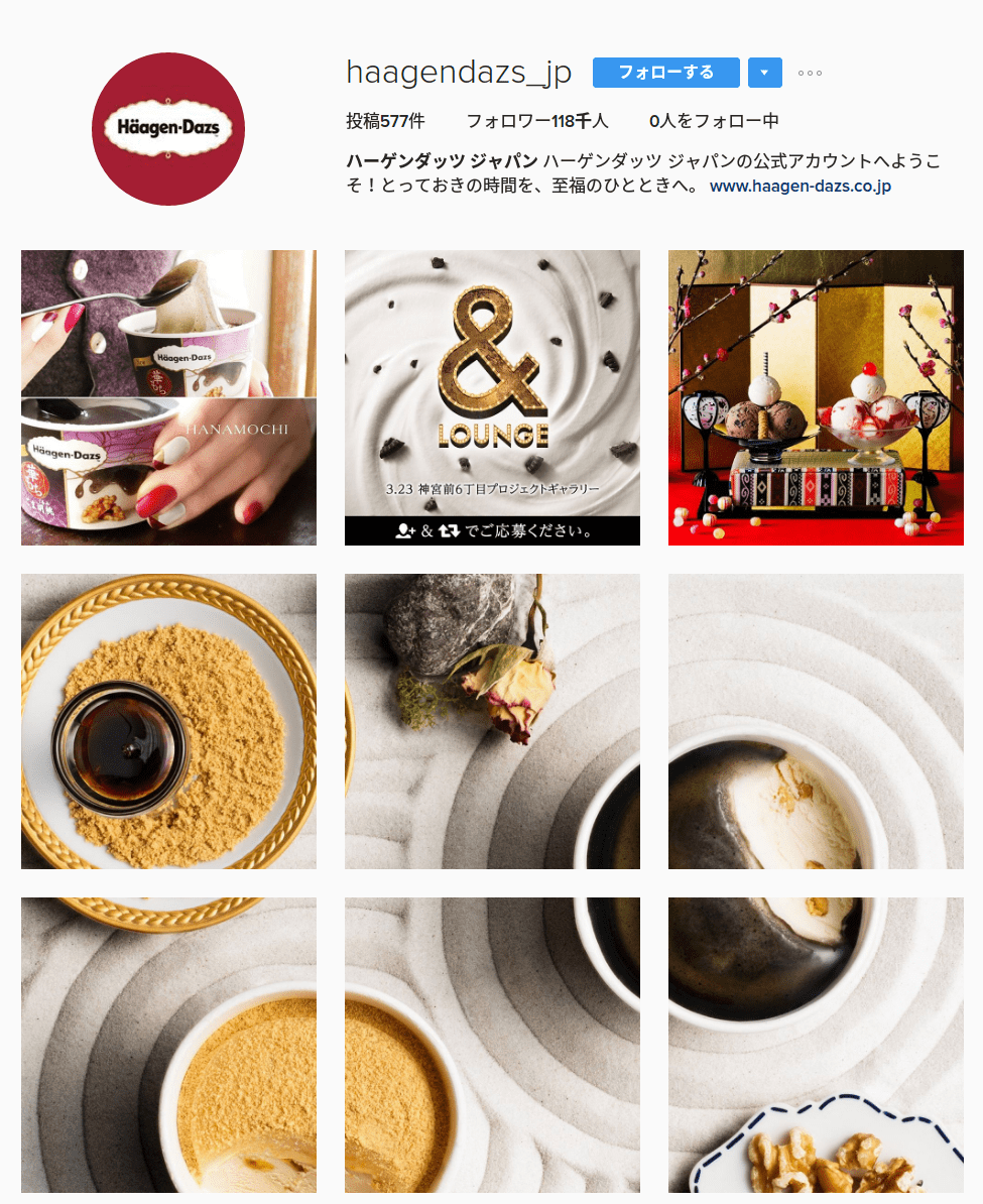大手アイスクリームメーカーとして知られる「ハーゲンダッツ ジャパン」。フォロワー数118,000人で、西洋風のオシャレな投稿が目立ちます。ハーゲンダッツを使ったスイーツの紹介、ヒミツなどを写真で投稿し、ファンの心を掴んできました。活用法としては、新商品を紹介する際に9枚の写真で1つの大写真に見せる手法を採用しています。モデルなどのインフルエンサーを活用したりと、1枚1枚の写真もきれいで美しくなっています。