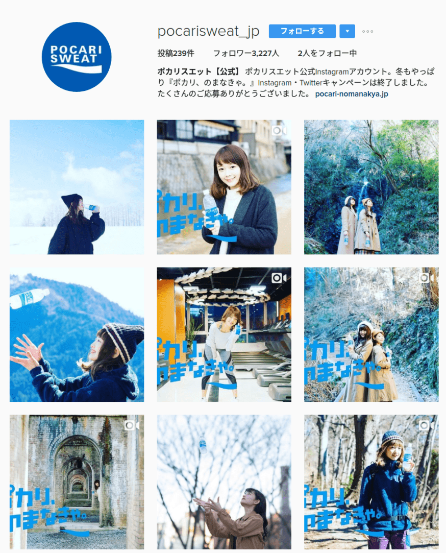 最後に紹介するのは大手飲料メーカーの「ポカリスエット」です。フォロワー数は3,255人で、「#ポカリのまなきゃ」で投稿するキャンペーンで一気に認知度をあげてきました。商品名や自社ブランドのハッシュタグで投稿するのではなく、投稿ユーザーの感覚に合わせたハッシュタグで非常に参加しやすいキャンペーンとなります。ユーザーからの写真投稿だけでなく、動画投稿も取り入れて変化をつけているのが印象的です。