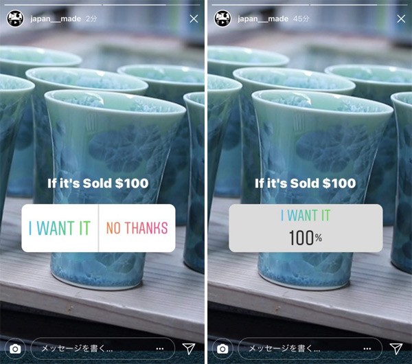 japan_madeは海外向けに日本の伝統工芸や文化を発信している動画メディアです。このアンケート例では「この商品を100ドルで欲しい?」と質問しています。投票結果を見ることで販売前に値段の妥当性や人気、需要などを事前調査できます。ECサイトを運営しているなら、ストーリーズのアンケート機能を使い商品の反響を調べることも可能です。