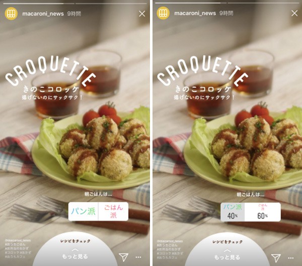 macaroni(マカロニ) はフォロワー49万人のレシピ動画の投稿サイトです。ジャンル別に多種多様なレシピが動画で見られるので人気です。マカロニもストーリーズを使ってアンケートを行っていますが、アンケートに参加した後はついつい「レシピをチェック(もっと見る)」をクリックしたくなる作りです。クリック後は公式サイトへ誘導するようになっているので、インスタグラムのアンケート機能をランディングページとして利用し、自社サイトへと上手く誘導しています。