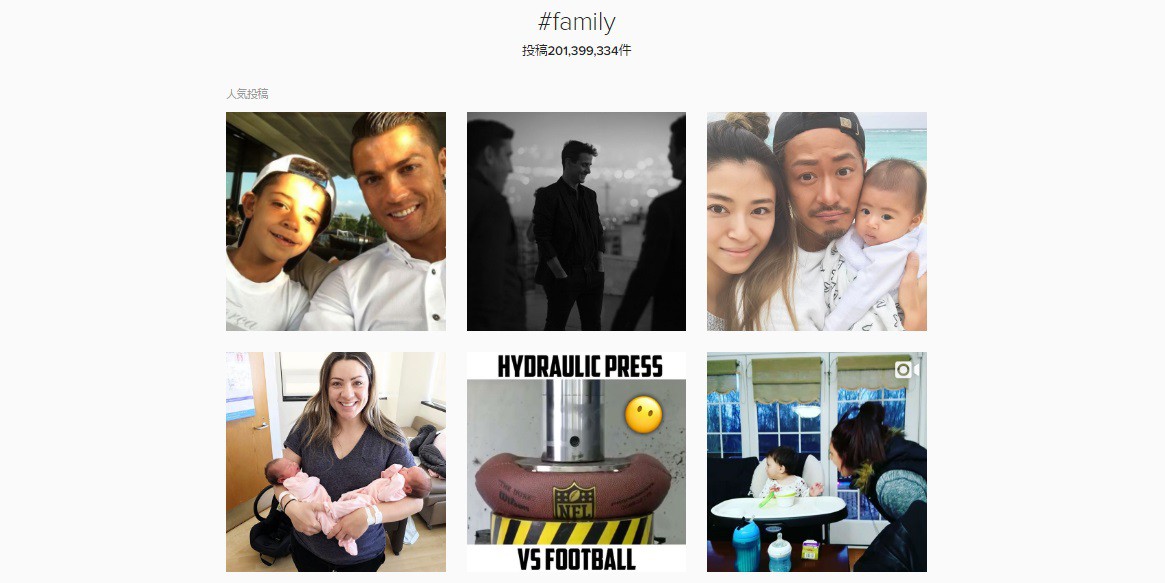 家族と一緒に過ごしている投稿につけられている人気のハッシュタグは#familyが人気で、投稿数は201,399,334件に登ります。他にも、#familydayなどが投稿3,497,905件で、いずれも多くのファミリー層に利用されています。投稿を見ていると、その多くは家族と過ごす充実した写真がアップされており、幸せそうな顔をしていう人が多い印象があります。