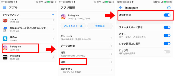 Abdroid7.0の場合の例では、「設定」から「アプリ」をタップしてアプリの一覧を表示させ、その中から「Instagram」を選びます。Instagramの設定画面内の「通知」をタップし、次の画面で「通知を許可」のトグルをオンにします。iPhone同様にここで通知方法も設定できます。