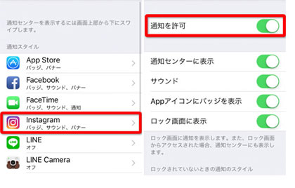 iPhoneやiPadなどのiOSの場合は「設定」アプリから「通知」をタップしてアプリの一覧を表示させ、その中から「Instagram」を選びます。一番上の「通知を許可」のトグルをオンに切り替えればプッシュ通知の設定が有効になります。ここではどのように通知を受け取るか通知方法も設定できます。