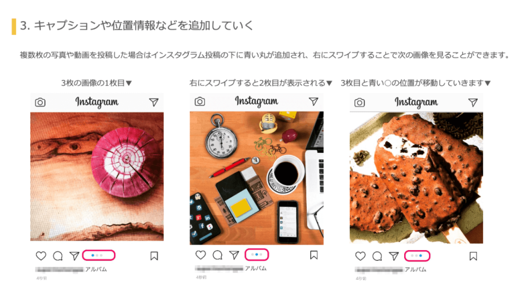 ちなみに、複数枚の写真や動画を投稿した場合はインスタグラム投稿の下に青い丸が追加され、右にスワイプすることで次の画像を見ることができます。