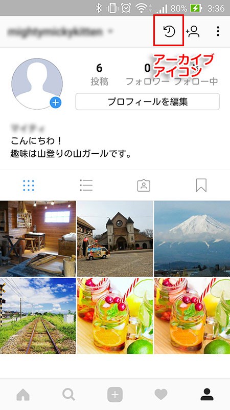 プロフィールページにいくと、右上に時計マークのアーカイブアイコンがあります。このアイコンをタップすると自分がアーカイブした画像を見ることができます。