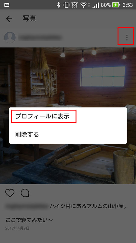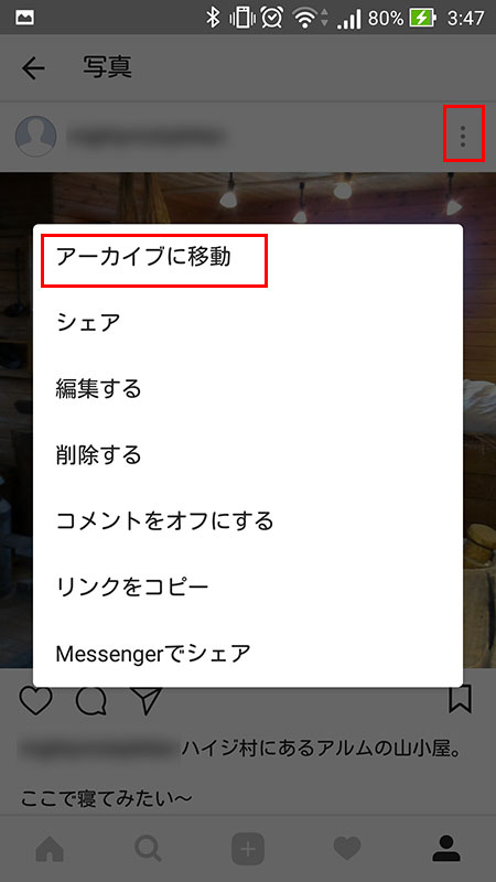 それではアーカイブする手順を説明していきます。まず、アーカイブしたい投稿にいきます。画面右上のオプションをタップするとオプションメニューが表示されるので、「アーカイブに移動」をタップします。これでタイムラインから投稿が消えてアーカイブされました。