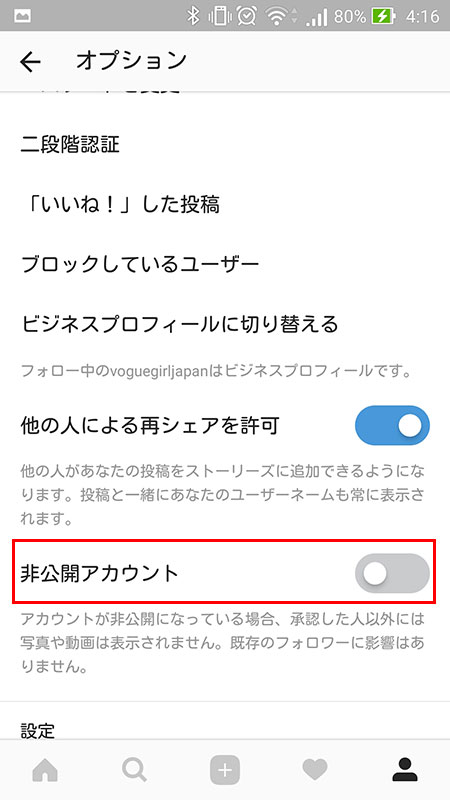 オプションメニューの「非公開アカウント」のトグルスイッチをオンにすれば即非公開になります。(従来のフォロワーには公開されています。)