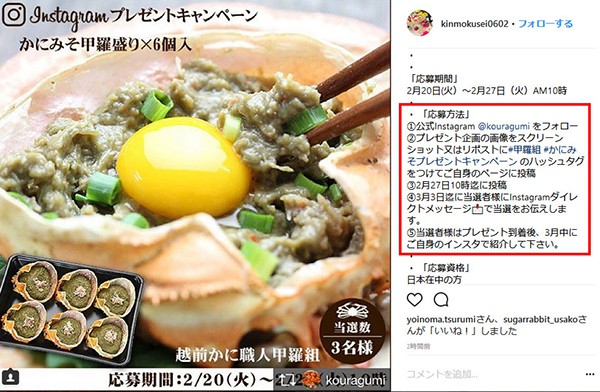 #甲羅組 #かにみそプレゼントキャンペーンのハッシュタグをつけてご自身のページに投稿