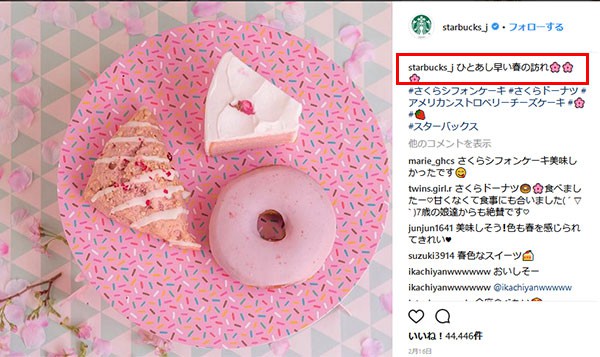 スターバックスの投稿例を見てみると、キャプションはシンプルに「ひとあし早い春の訪れ」と書かれています。春というキーワードを活かすように桜の絵文字、写真もピンクが主体の桜や春をイメージさせるような素材を用いています。投稿に季節感をもたせ、あくまで写真をメインに、キャプションでさりげなく春色スイーツを紹介できるように工夫しています。