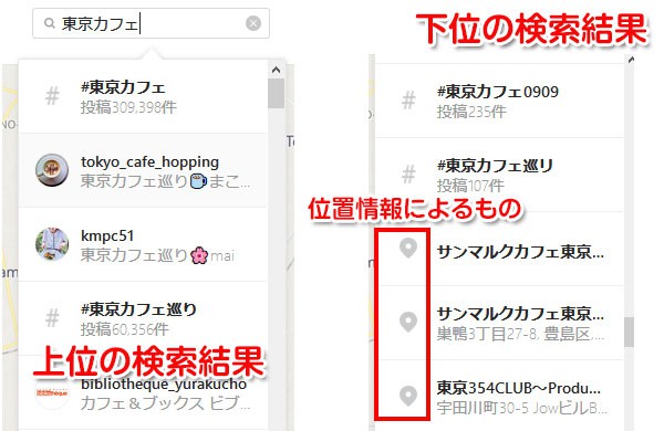ジオタグによる検索優先度はハッシュタグと比較すると劣ります。例えば「東京カフェ」と検索した場合、図のようにまずハッシュタグによる投稿の検索結果、次にユーザー名に東京カフェを含むものなどが出てきて、位置情報による結果はさらにその下に表示されます。