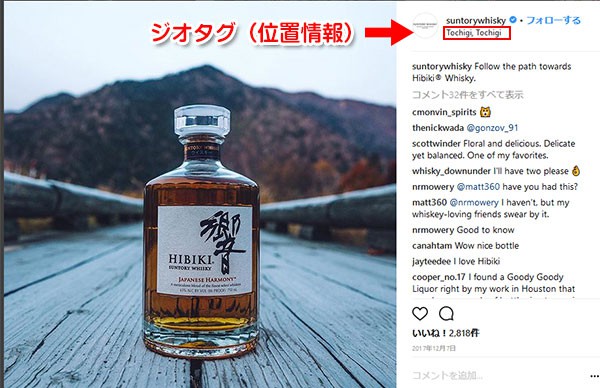 サントリーウィスキーは海外展開に向けて英語で情報を発信しています。自社のウィスキーを日本各地の風景と組み合わせた被写体にしてジオタグと一緒に投稿しています。洗練された風景画は、日本好きな人の目に思わずとまるようなアイデアです。