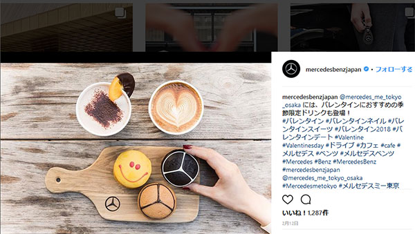 メルセデスベンツは季節やシーズンイベントに合わせたハッシュタグをシリーズ化して用いています。画像の例では「バレンタイン」をテーマに#バレンタイン #バレンタインネイル #バレンタインスイーツ #バレンタイン2018 #バレンタインデート #Valentine #Valentinesday といったハッシュタグを羅列しています。