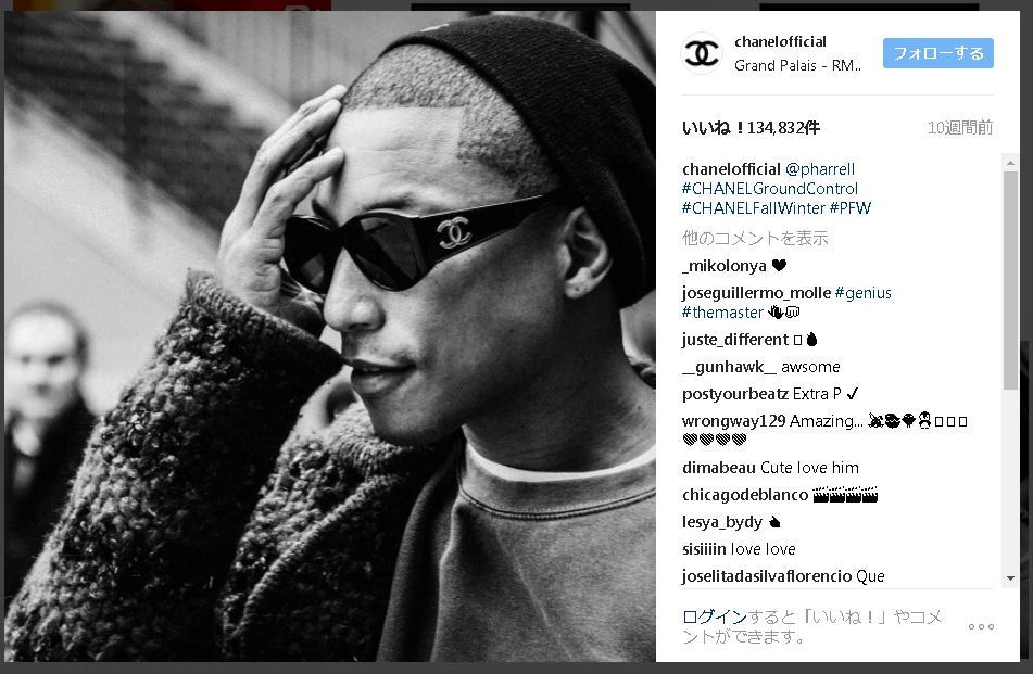 ファレル・ウィリアムスを始めとする世界的知名度を誇るアーティストも多数、CHANELの投稿には登場します。