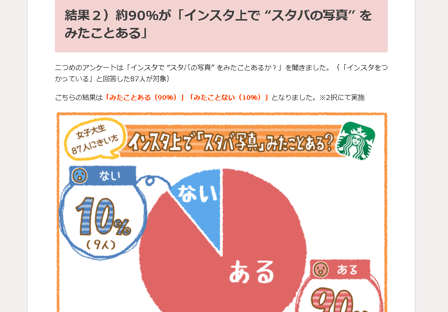 首都圏の女子大生100人を対象としたアンケートでは100人中87人がInstagramを利用しており、そのうち90%が「スタバの写真」をフィードで見たことがあると回答しています。