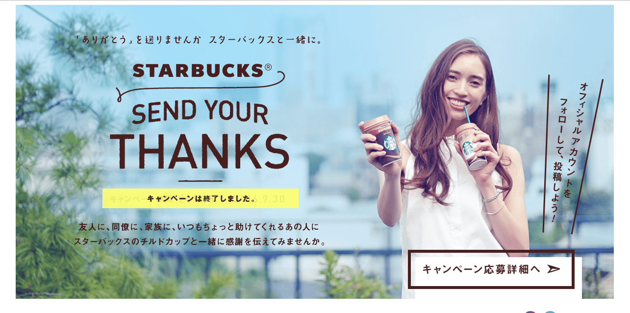 2016年8月1日~2016年10月31日まで、スターバックスのチルド飲料と映った写真をInstagram・twitterに投稿し、お世話になっている人に「ありがとう」を送る『Starbucks Send Your Thanks キャンペーン』が行われました。