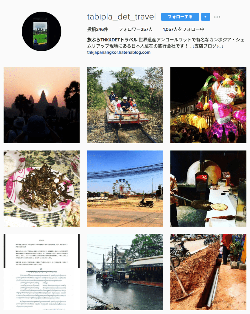 カンボジアにあるシェムリアップ州に特化した「TNK&DETトラベル」。フォロワー数は401人と大手の旅行会社に比べると少なくなっていますが、同地域での情報が様々な写真で共有されていて独特な世界観が伝わってきます。投稿内容は、シェムリアップ州内の風景やテーマパーク、レストランといった幅広いジャンルの写真が投稿されています。
