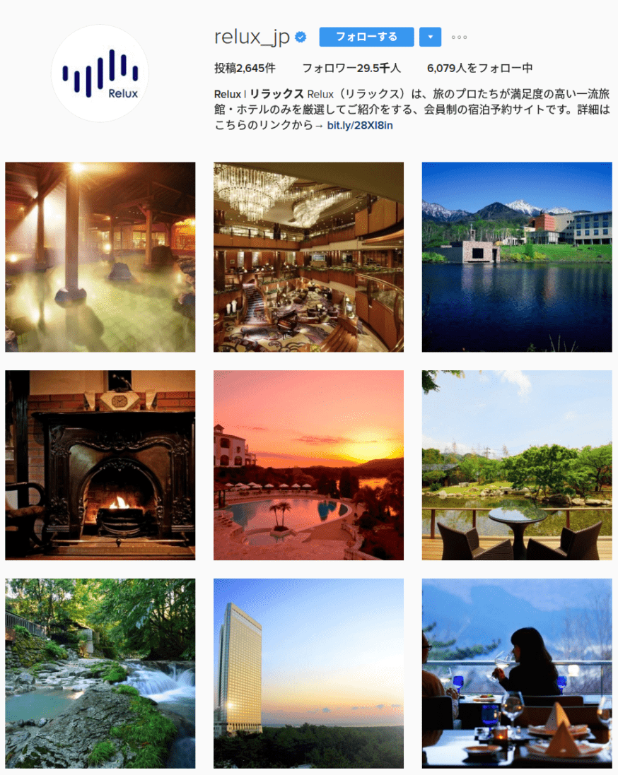 会員制宿泊予約サイトの「Relux」を運営する株式会社Loco Partners。1日1件投稿するスタイルを取り入れており、フォロワー数は約28,800人と比較的多くなっています。投稿する写真は宿泊施設の外観や客室が大半で、しっかりと自社のブランディングができているアカウントとなっています。