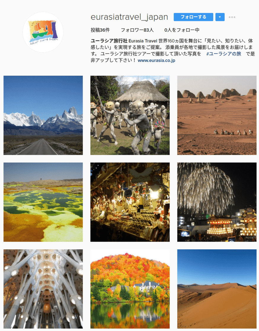 投稿数約35件、フォロワー数83人(2017年3月現在)と小規模なアカウント「ユーラシア旅行社」。投稿頻度も不定期となっていますが、ツアーで同行した従業員が各地で撮った写真にリアリティーがあると話題になっています。臨場感溢れる写真に釘付けになること間違いありません。旅行・観光業らしさのある投稿内容で多くの人の心をつかんでいます。