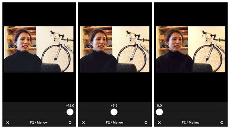 仮に適用するフィルターをF2に選び、下の黒くなっているF2の箇所をタップすると、